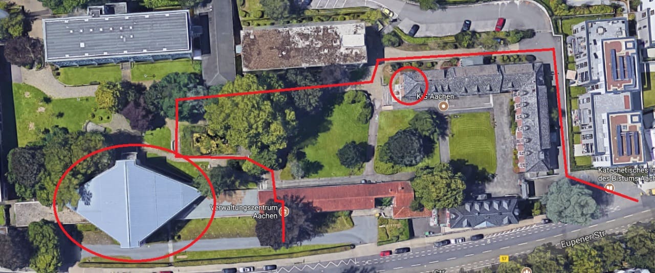 You can reach the chapel of the Pius-Gymnasium via the entrance of Haus Eich (Eupener Str. 136, 52066 Aachen) or via the entrance of the Aachen administration center (Eupener Straße 142, 52066 Aachen).